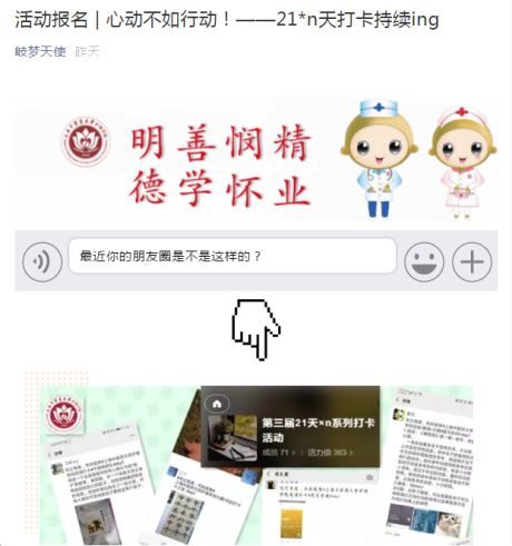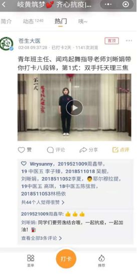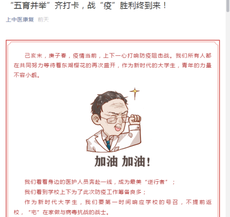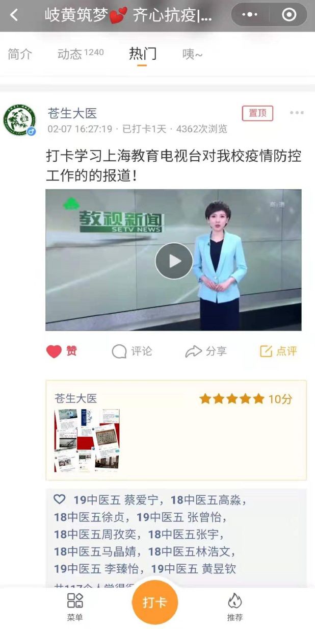 中医理论的“火”有着能快速延展的特点。辅导员通过加强网络思想教育,加强学生网络舆情引导,粉碎谣言,主动占领网络思想政治教育新阵地。基础医学院的辅导员,组织创立“岐黄筑梦•齐心抗疫”打卡圈,吸引了全校540多名师生参与,打卡动态日记1300多篇,内容涉及疫情防控、居家抗疫、志愿奉献、经典学习、功法练习、书法爱好及心理防疫等方面,积极传递正能量,迅速占领网络高地。上海教育电视台对天游ty8线路官网疫情防控工作的报道在学生群体中广泛传播,视频阅读量达到了近4500次。“进圈打卡”正成为一种居家抗疫、共同进步的师生互动教育有效形式。护理学院和康复医学院辅导员通过系列打卡活动,注重信息筛选,潜移默化地传递正确价值观,缓解学生们的焦虑情绪,激发大学生们战胜疫情的信心。