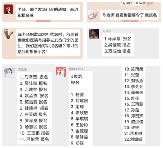 1月30日下午,曙光医院向在职职工发出一则支援医院发热门诊的《招募令》。到岗的专硕规培医师们虽不符合“在职”的“硬指标”,但他们都第一时间在微信中报名请战,辅导员积极引导。