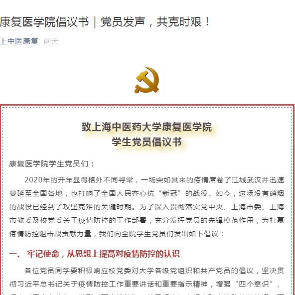 针灸推拿学院2016级学生李一璇利用专业所学,向家人科普新型冠状病毒的传播途径、预防方法等。2018级的学生周轶和古丽扎,走进当地社区、医院,志愿服务一线。古丽扎还在医院病房里,教病人学习太极拳。中药学院和康复医学院辅导员激励学生党员坚定信心,共克时艰,为打赢疫情防控阻击战作出贡献,让党旗在防疫抗疫第一线高高飘扬。