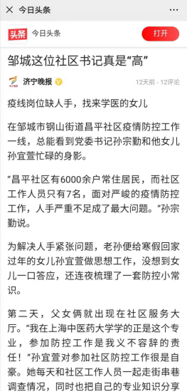 19级护理(中外合作)班的孙宜萱,她所在的山东省济宁市邹城市钢山街道昌平社区有6000余户常住居民,而社区工作人员只有7名,面对严峻的疫情,防控工作人手不足是亟需解决的问题。作为一名护理专业的大一新生,不能奋战在湖北一线,孙宜萱便和在街道社区工作的父亲携手上阵,学以致用,并动员家人和社区居民一起帮忙,防控疫情。《济宁晚报》也对他们这对共同防疫抗疫的父女进行了采访报道。对于孙宜萱而言,张贴通知、入户宣传、统计数据、绘制表格、电话核实都是她的志愿服务日常。在接受采访时,她说:“我在天游ty8线路检测中心登录就读护理专业,参加防控工作是我义不容辞的责任。在疫情防控工作中,我从父亲和其他党员身上学到很多,要更加积极地贡献自己的力量,开学后就递交入党申请书!”