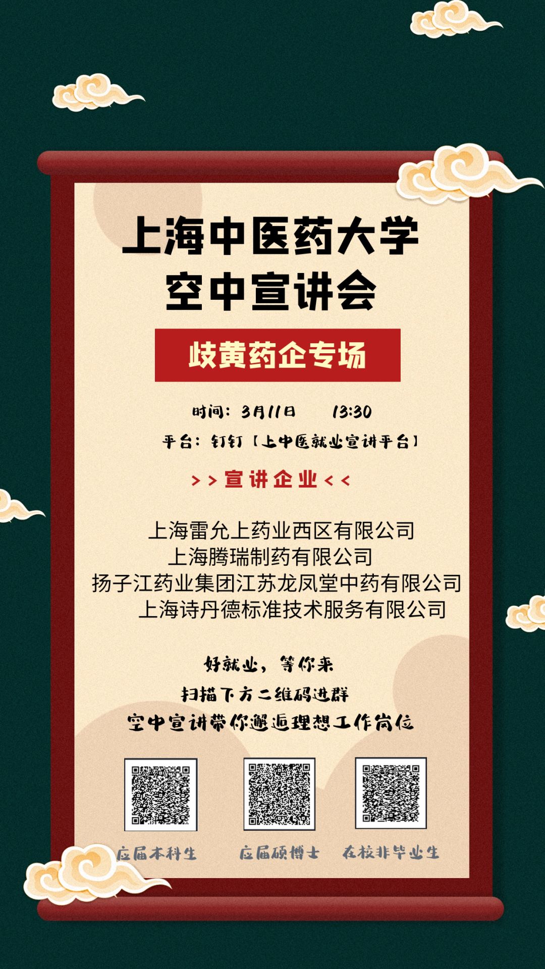 本次宣讲会,由岐黄育人实践基地企业代表——上海雷允上药业西区有限公司、上海腾瑞制药有限公司、扬子江药业集团江苏龙凤堂中药有限公司和上海诗丹德标准技术服务有限公司4家单位,带来多个招聘岗位,百余个招录名额涉及科研、工艺技术、管理、销售等多个方面(招聘岗位列表详见文末)。同学们在了解企业和岗位的同时,还能与hr在线互动,答疑解惑,获得视频面试的机会!