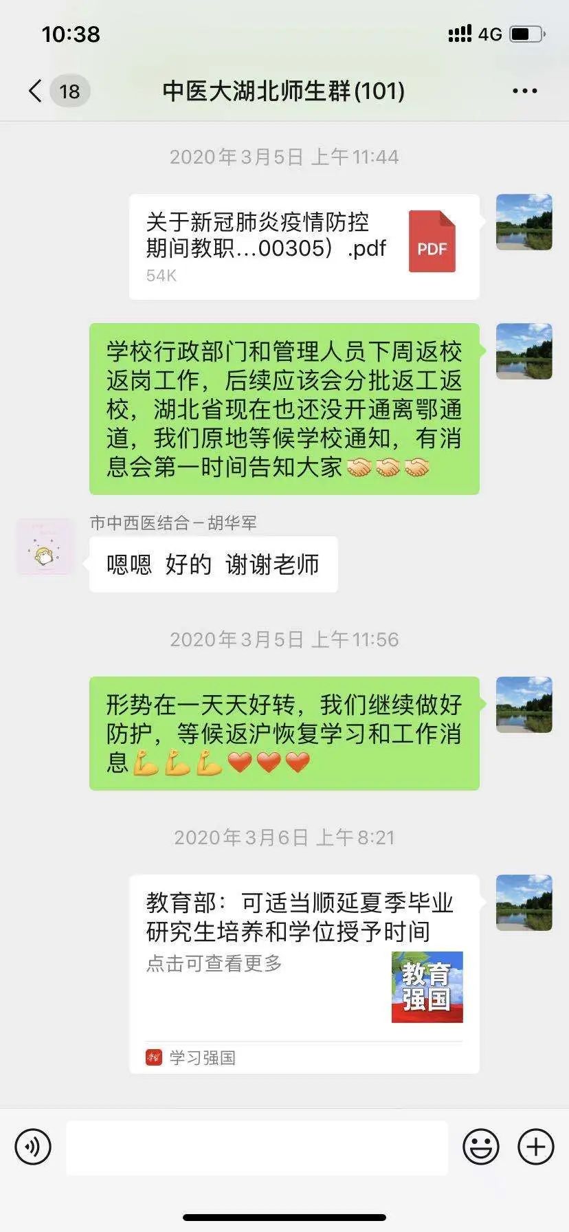 湖北疫情发生以来,学校党委高度重视身在湖北各地的师生情况,通过摸排,了解到留鄂的教师员工有11人、学生有102人。在了解人员的基本情况后,因探亲留在湖北、校公共健康学院党总支书记段艳霞牵头,分别建立了6位教工党员、17位学生党员的微信群以及全体留鄂师生的微信群,充分发挥师生党员先锋模范作用,作为联系学校和湖北师生的重要纽带,发挥安抚稳定作用,加强疏导和指导功能。师生党员通过微信群,深入了解身在湖北师生所在地区和家人情况,及时发布一些政府官方媒体和学校关于疫情防控、教学科研和学生动态管理的精神、今年就业指导动态变化等信息,帮助学生,尤其是毕业班学生做好相关事宜。由于居家隔离时间较长,有部分同学出现焦虑心理,老师们和其他同学还会做一些心理疏导,鼓励大家共克时艰,坚持不懈。