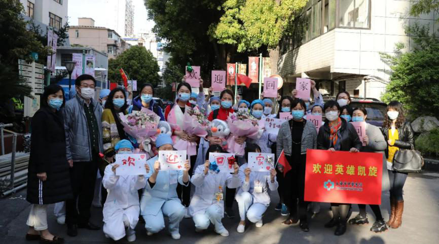 附属龙华医院援鄂队员李群、李黎梅、刘蕙宁在医院举办的欢迎仪式上,收到了院方特制的援鄂纪念相框,表示作为党员,将不忘初心,回归岗位后继续发扬援鄂精神。据悉抵沪2天后,她们又向院领导递交联名请战书,希望休整过后再赴阻击境外疫情输入的一线,直至全面赢取疫情防控最终胜利。