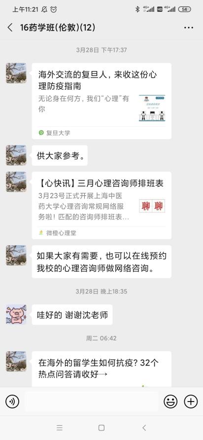 早在国内爆发疫情时,辅导员已经开始关心关注各位学生的思想状态,及时跟进并做必要提醒。国外疫情大爆发后,得知部分学生产生焦虑恐慌情绪,学院立即通过辅导员及时了解学生的诉求。为帮助部分决定回国的学生,学校一边积极与英方协商推进,一边把上海出入境管理局和上海疾控中心等相关部门的权威信息及时转发给学生。学院及时制定《给家长的一封邮件》,告知各位家长事情推进状况,解答相关问题,并做必要的提醒,积极与家长进行联动沟通,最终有3位学生顺利回国。