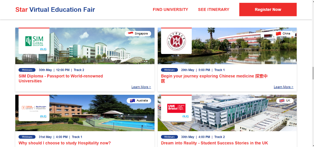 5月29日至31日,2020星报云端教育展(2020 STARVIRTUAL EDUCATION FAIR)举办。该教育展由马来西亚发行量最大的英文日报《星报》主办,有来自马来西亚和全球近50所大学,如澳大利亚墨尔本大学、英国诺丁汉大学等参加。天游ty8线路官网是国内唯一一所参加了本次教育展的大学。