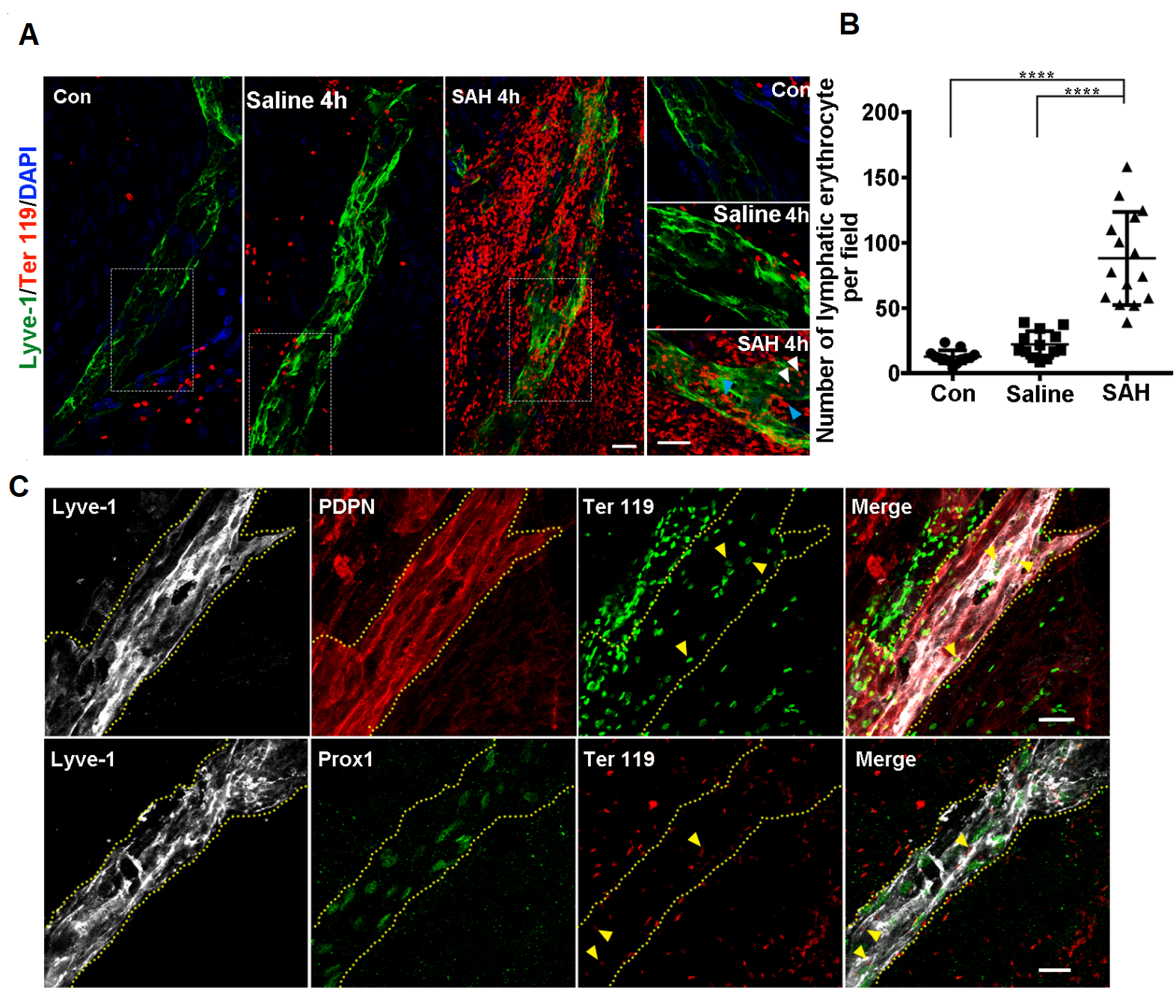 出血是一种常见的病理现象,但是至今为止,出血后血细胞的清除机制仍然不是十分清楚。淋巴管系统具有回流大分子蛋白和免疫细胞的作用,但是,淋巴管系统是否参与血细胞的清除过程仍是未解之谜。蛛网膜下腔出血是引起脑底部或脑、脊髓表面的血管发生破裂、血液直接流入蛛网膜下腔引起的急性综合征,临床表现为剧烈头痛、呕吐、脑膜刺激征和血性脑脊液。其发生年龄早、死亡率和致残率高、且临床预后差。因此,清除血细胞可能有助于减轻蛛网膜下腔出血造成的病理损伤。硬脑膜淋巴管表达与外周淋巴管内皮细胞同样的表面抗原,具有回流脑脊液中的大分子物质及免疫细胞到颈部淋巴结、参与中枢神经系统免疫调节等功能。但是硬脑膜淋巴管是否可以回流脑脊液中的红细胞尚不清楚。