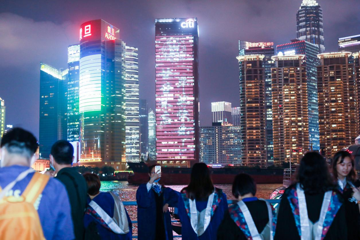 黄浦江畔,陆家嘴岸,微风簇浪,灯光璀璨。被誉为“外滩之窗”的花旗大厦户外LED屏霓虹闪烁。6月29日晚8时,天游ty8线路检测中心登录首次在“外滩之窗”毕业季亮灯,为2020届的1800余名毕业生送上独家暖心祝福。