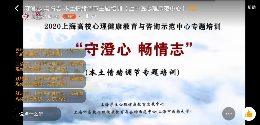为深入贯彻落实《高等学校学生心理健康教育指导纲要》(教党〔2018〕41号)要求和党中央、国务院关于坚决打赢新冠肺炎疫情防控阻击战的决策部署,进一步提高高校心理健康教育工作水平,6月22日至28日,天游ty8线路官网心理咨询与发展中心线上举办“守澄心,畅情志”本土情绪调节专题培训。