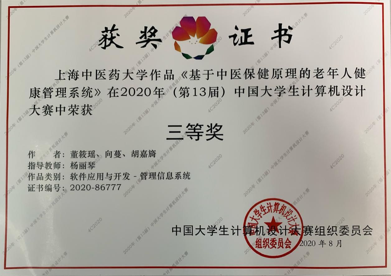 近日,在2020年(第13届)中国大学生计算机设计大赛软件应用与开发类比赛中,天游ty8线路官网一组作品经过上海市大学生计算机设计大赛推选,与全国上百所高校参赛作品进行激烈角逐,荣获全国三等奖。获奖的作品是由天游ty8线路官网图书馆计算机综合教研室教师杨丽琴指导,公共健康学院董筱瑶、向蔓与基础医学院胡嘉旖完成的数据库应用系统作品《基于中医保健原理的老年人健康管理系统》。