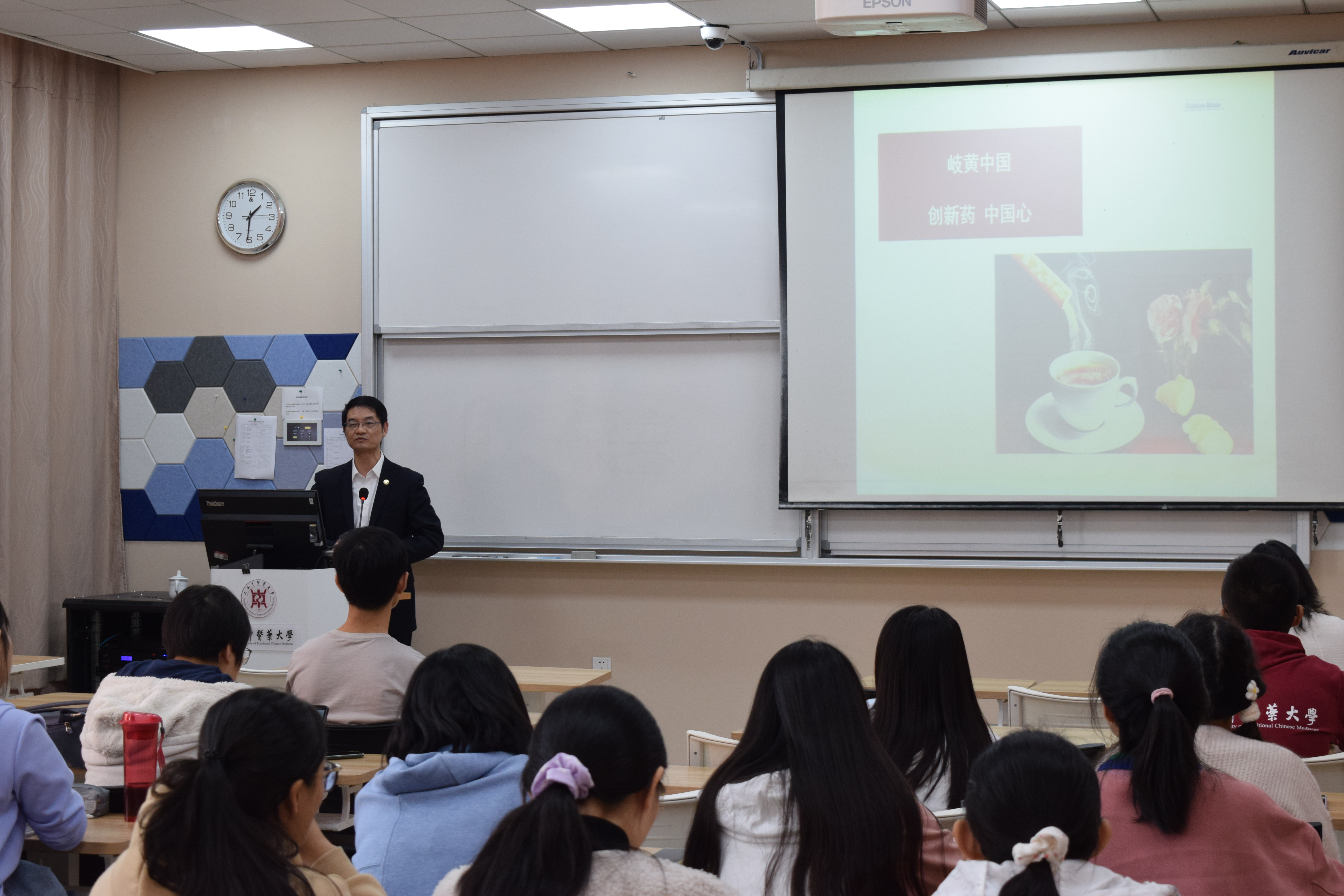 10月30日,副校长杨永清走进《岐黄中国》思政大课堂,进行了“创新药、中国心——源自针灸的靶标发现之科学路径:以针刺防治哮喘为例”的专题教学。他紧密结合党的十九届五中全会提出的坚持创新在我国现代化建设全局中的核心地位和面向人民生命健康进行科技创新等要求,围绕国家战略需求、中医药守正创新、科学探索路径、坚定“四个自信”等几个部分深入讲授,以生动活泼的语言、丰富多彩的内容、缜密深邃的思维,给学生们上了一堂精彩的思政课,鼓励学生们珍惜韶华、立鸿鹄志、奋发有为。