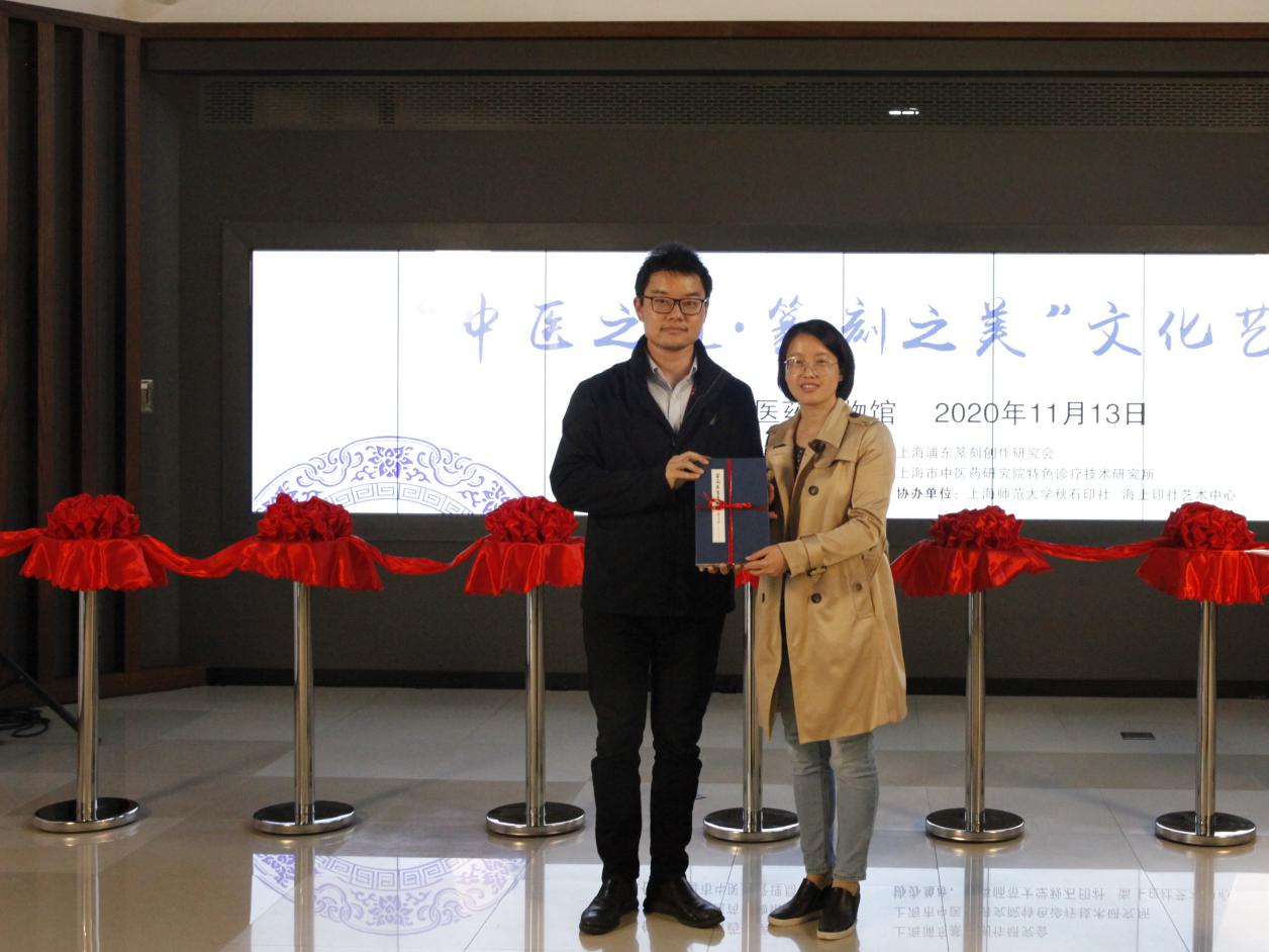 仪式上,任《灵兰名言篆刻选》主编之一的曙光医院党委副书记姚政将篆刻原拓本赠予上海中医药博物馆与上海浦东篆刻创作研究会。张遴骏代表上海浦东篆刻创作研究会,副馆长王丽丽代表上海中医药博物馆分别接受捐赠。