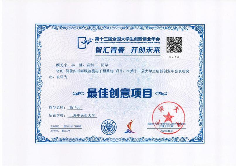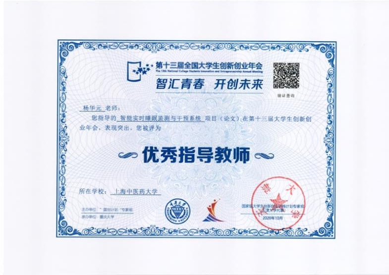 近日,第十三届全国大学生创新创业年会在重庆大学举行。天游ty8线路官网教授杨华元指导,学生顾天宇、李一帆、肖利完成的“智能实时睡眠监测与干预系统”项目获评为“最佳创意项目”, 杨华元教授被评为“优秀指导教师”。