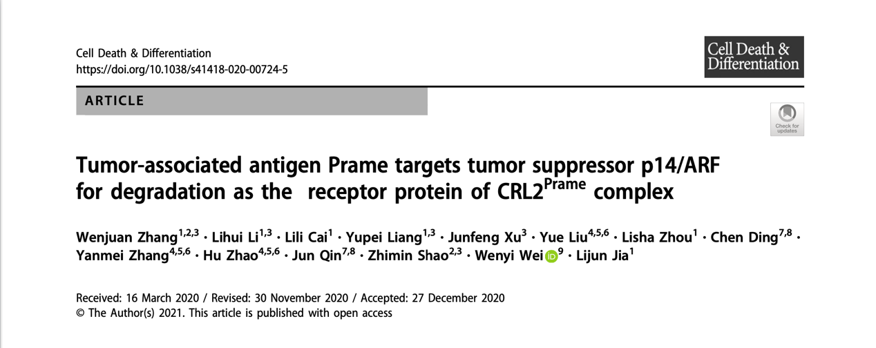 龙华医院贾立军研究员团队揭示CRL2-Prame泛素连接酶复合体介导抑癌蛋白p14/ARF降解调控肿瘤发生新机制