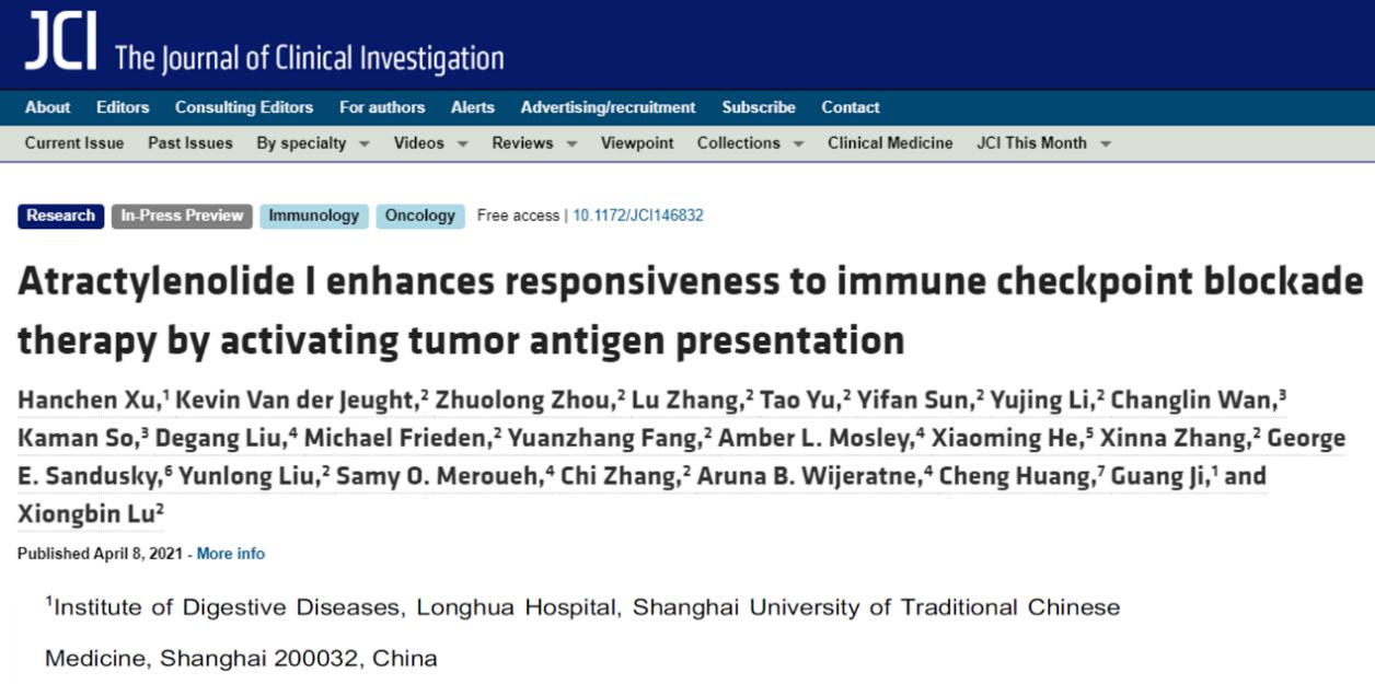 近日,天游ty8线路官网附属龙华医院脾胃病研究所季光教授科研团队以及天游ty8线路检测中心登录中药学院黄诚教授、印第安纳大学Xiongbin Lu教授合作在中医药联合肿瘤免疫治疗方面取得重要进展,研究成果Atractylenolide I enhances responsiveness to immune checkpoint blockade therapy by activating tumor antigen presentation在线发表于国际著名医学期刊Journal of Clinical Investigation。研究证实了益气健脾中药白术主要成分白术内酯I能够有效促进肿瘤细胞的抗原呈递,从而增强结直肠癌对免疫检查点抑制剂治疗的应答效率,与PD-1单抗联合治疗能够发挥协同增效的作用。该研究丰富了中医“扶正治癌”理论的科学内涵,为中医药联合肿瘤免疫治疗的临床应用提供了依据。