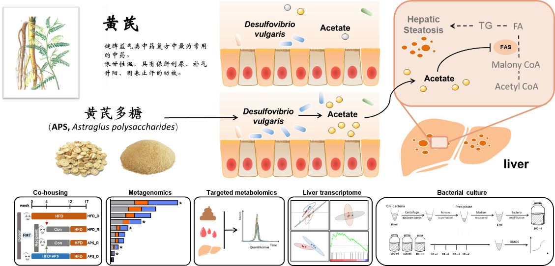 李后开教授团队在前期研究中证实益气类中药黄芪的主要有效部位——黄芪多糖具有改善肥胖和NAFLD的作用,并通过宏基因组联合非靶向代谢组学分析观察到黄芪多糖对肠道菌群和菌群代谢物的调节作用,提出了黄芪多糖改善NAFLD形成的“药物-肠道菌-菌群代谢物-宿主代谢”关系轴假说。基于该科学假说,研究团队通过多组学联合策略深入探寻黄芪多糖所调节的特定肠道细菌及相关的代谢物,发现黄芪多糖改善NAFLD的作用不仅具有菌群依赖性特征,而且能够显著富集肠道细菌,Desulfovibrio vulgaris菌。进一步的研究证实,该菌不仅是一个天然的H2S产生菌,而且具有高效的产生乙酸的能力。外源性补充该菌能够显著改善高脂饮食喂养小鼠的肝脏脂肪变性、胰岛素敏感性及体重增长。通过肝脏RNA seq分析及分子生物学研究证实该菌改善NAFLD的作用与抑制肝脏FASN和CD36蛋白表达有关。本研究为解释黄芪多糖改善NAFLD的作用机理提供了新证据,也为借助多组学技术探索植物多糖调节肠道菌群改善宿主代谢的机理研究提供参考。