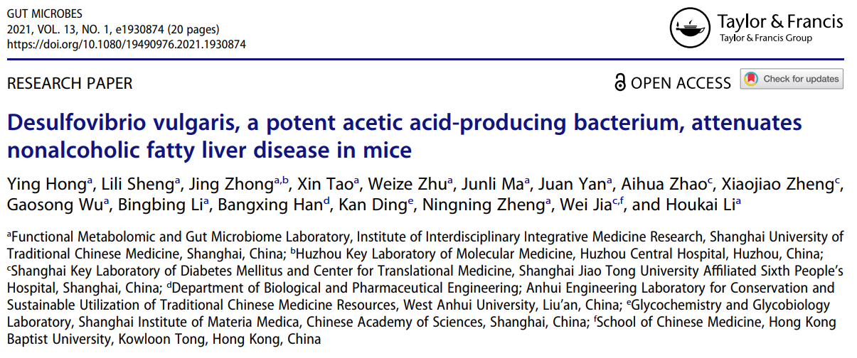 近日,天游ty8线路官网交叉科学研究院李后开教授团队在国际微生物学期刊Gut microbes(一区)在线发表了题为《高效产乙酸菌Desulfovibrio vulgaris改善小鼠非酒精性脂肪性肝病》(Desulfovibrio vulgaris, a potent acetic acid-producing bacterium, attenuates nonalcoholic fatty liver disease in mice)的研究论文。