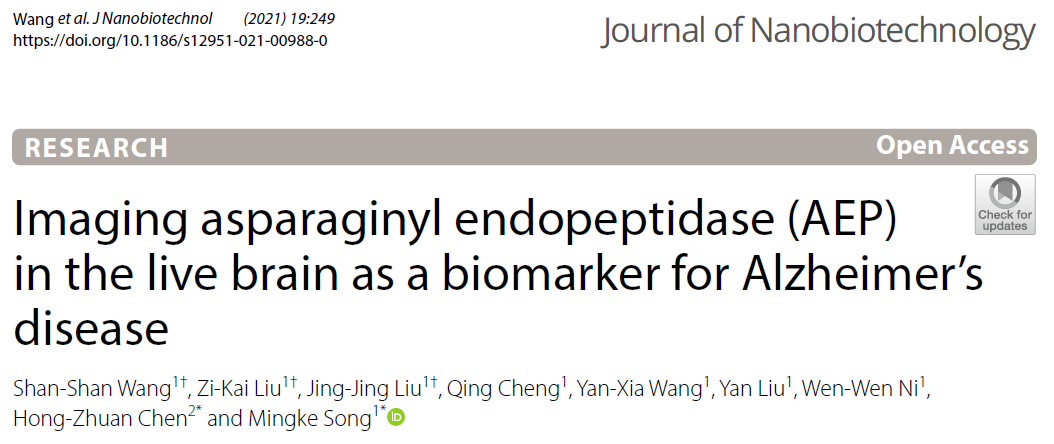 从早期生物标志物,构建荧光纳米探针和大脑成像新技术。研究工作在Journal of Nanobiotechnology在线发表,论文标题为Imaging asparaginyl endopeptidase(AEP) in the live brain as a biomarker for Alzheimer's Disease(https://doi.org/10.1186/s12951-021-00988-0)。已知AD患者和动物模型脑组织的天冬酰胺内肽酶(AEP)出现增年性明显上调,AEP过度激活可引起tau蛋白病理性剪切和促进Aβ生成,被认为是AD发病早期启动因子和潜在药物靶标。研究团队在前期模拟脑衰老及退行性变的SAMP8快速老化小鼠揭示AEP可作为AD疾病修饰干预的药理学靶点,论文正式发表于Translational Neurodegeneration,题目为Pharmacological inhibition of asparaginyl endopeptidase by δ-secretase inhibitor 11 mitigates Alzheimer’s disease-related pathologies in a senescence-accelerated mouse model(https://doi.org/10.1186/s40035-021-00235-4)。在此研究基础上,进一步利用AD模型APP/PS1小鼠证明AEP月龄相关病理变化特征,特异性AEP抑制剂可有效阻止AD的早期病理进展。同时,率先设计并构建了AEP活性依赖的荧光纳米探针,进一步应用小动物活体成像技术对其脑部AEP进行成像分析,显示5-8月龄APP/PS1小鼠AEP活性动态增高的特征,为AEP大脑成像手段作为AD早期生物标志物转化研究提供实验依据。研究团队宋明柯副研究员和天游ty8线路官网陈红专教授为2篇论文共同通讯作者。