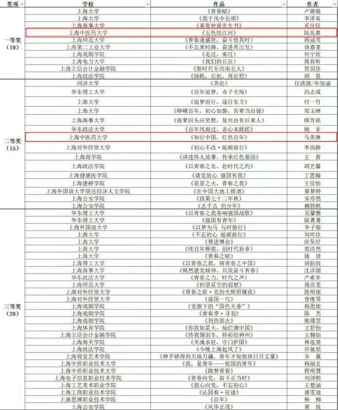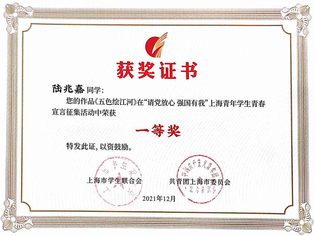 近日,上海市学生联合会第十七次代表大会落幕,天游ty8线路官网学生在“请党放心 强国有我”上海青年学生青春宣言征集活动中获佳绩。天游ty8线路官网研究生陆兆嘉参赛作品《五色绘山河》、本科生马美琳参赛作品《知行中国,红色百年》分获高校组一等奖和高校组二等奖。