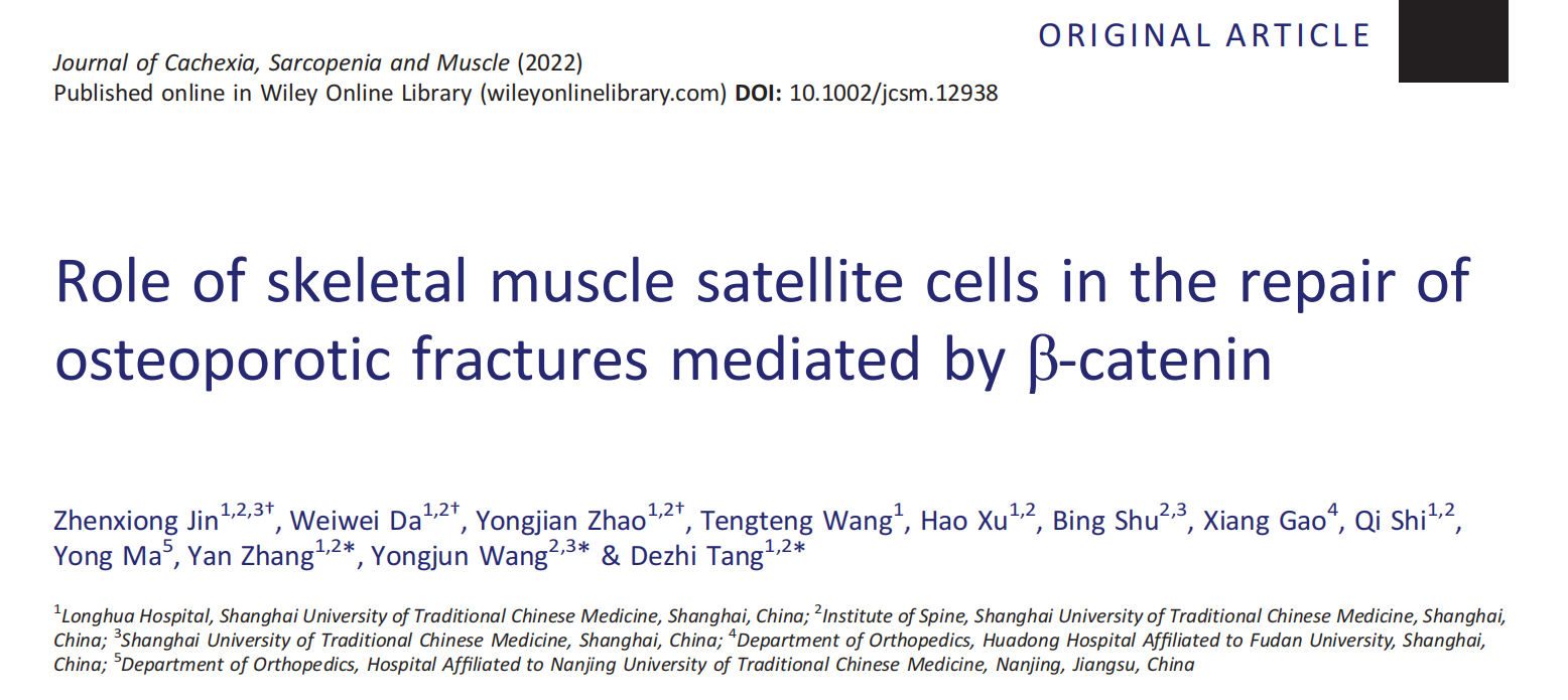 近日,天游ty8线路官网附属龙华医院及脊柱病研究所、教育部筋骨理论与治法重点实验室研究团队在肌肉研究领域国际顶级期刊《恶病质、肌肉减少症和肌肉杂志》(Journal of Cachexia, Sarcopenia and Muscle)发表了题为Role of skeletal muscle satellite cells in the repair of osteoporotic fractures mediated by β-catenin的研究文章,在国际上率先证明骨骼肌卫星细胞中的β-catenin信号在骨质疏松性骨折愈合过程中发挥重要作用,从现代生物学角度阐明了“筋损骨衰”中医病机理论的科学依据。该论文第一作者为天游ty8线路官网2018级硕士研究生金镇雄,笪巍伟主治医师和赵永见副主任技师为共同第一作者,脊柱病研究所唐德志研究员为通讯作者,王拥军教授和张岩研究员为共同通讯作者。该研究得到国家科技部重点研发计划项目(2018YFC1704300)、国家自然科学基金面上项目(81973883)等项目资助。