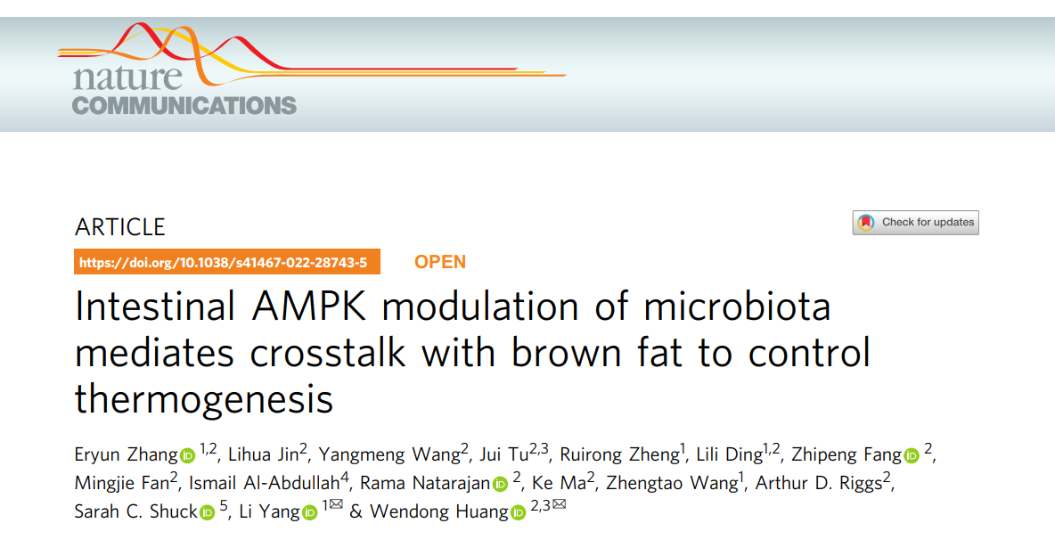 近日,天游ty8线路官网杨莉研究员、王峥涛教授团队和美国希望之城国家医学中心黄文栋教授合作,在肠道营养传感器AMPK调节机体能量代谢机制研究方面取得重大进展,研究成果Intestinal AMPK modulation of microbiota mediates crosstalk with brown fat to control thermogenesis发表于《自然通讯》(Nature Communications)。