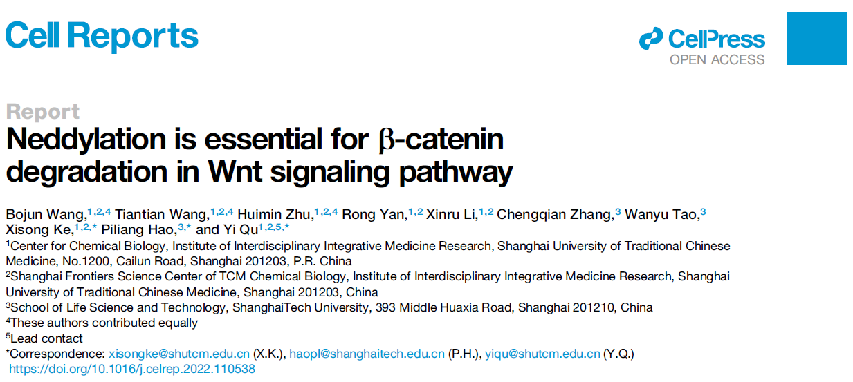 天游ty8线路官网交叉科学研究院中药化学生物学研究中心屈祎课题组继2022年2月在Cell Reports报道结肠癌关键治疗靶标β-catenin的新型蛋白互作及其靶向中药小分子LDA(Yan R, et al, Cell Reports 2022),最近又利用特异性小分子抑制剂,揭示β-catenin降解新机制,并鉴定β-catenin类泛素NEDD8修饰及其E3修饰酶β-TrCP2。基于相关结果的研究论文已经在最新一期的Cell Reports在线发表(Wang B, et al, Cell Reports 2022)。