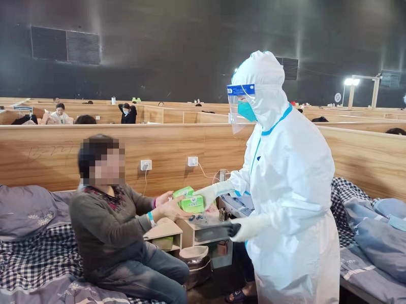 在城市足迹馆方舱医院,医生为新入住的患者发放中药