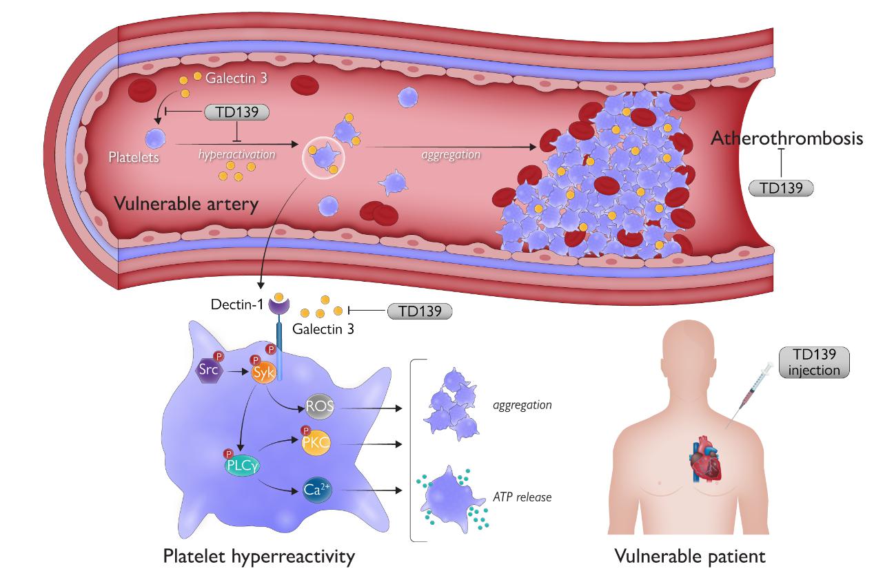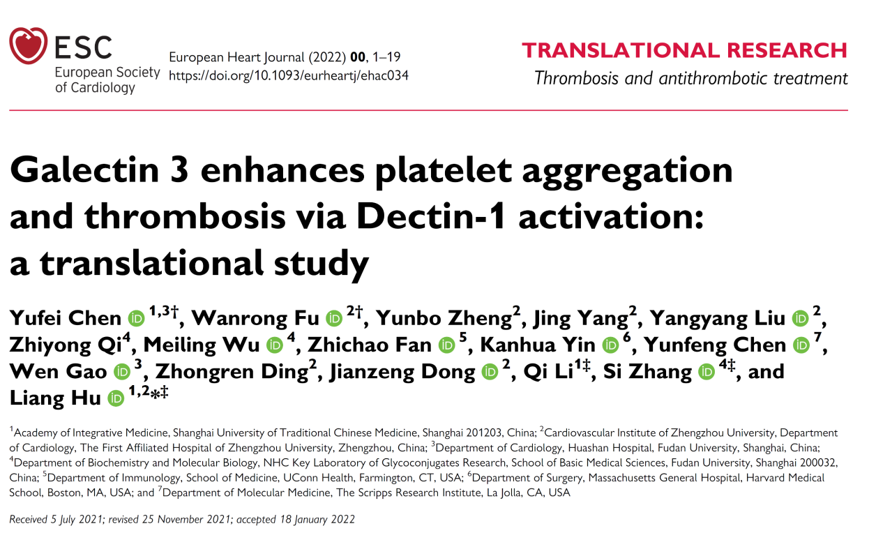 近日,欧洲心脏协会会刊European Heart Journal以Research Article在线发表了天游ty8线路官网中西医结合研究院胡亮团队最新研究成果Galectin 3 enhances platelet aggregation and thrombosis via Dectin-1 activation: a translational study,首次提出:Galectin-3结合血小板膜表面的C型凝集素Dectin-1受体,促进血小板聚集和血栓形成;TD139作为一种II期临床试验中应用的Galectin-3抑制剂,能抑制Galectin-3介导的血小板活化和血栓形成,且不加剧出血风险;靶向Galectin-3可能作为心血管疾病治疗的新策略。针对Galectin 3/Dectin-1信号通路,研究团队发现柑橘果胶和β-葡聚糖等多个具有优秀的抗血小板作用的天然活性产物。