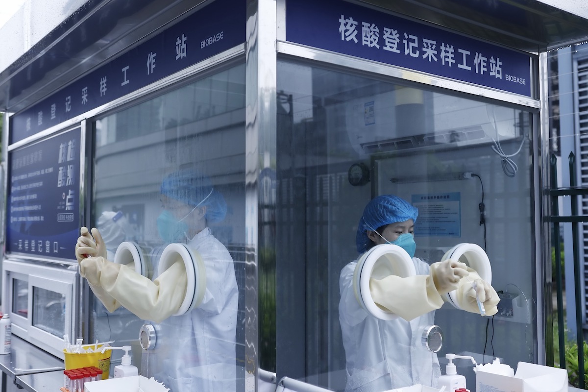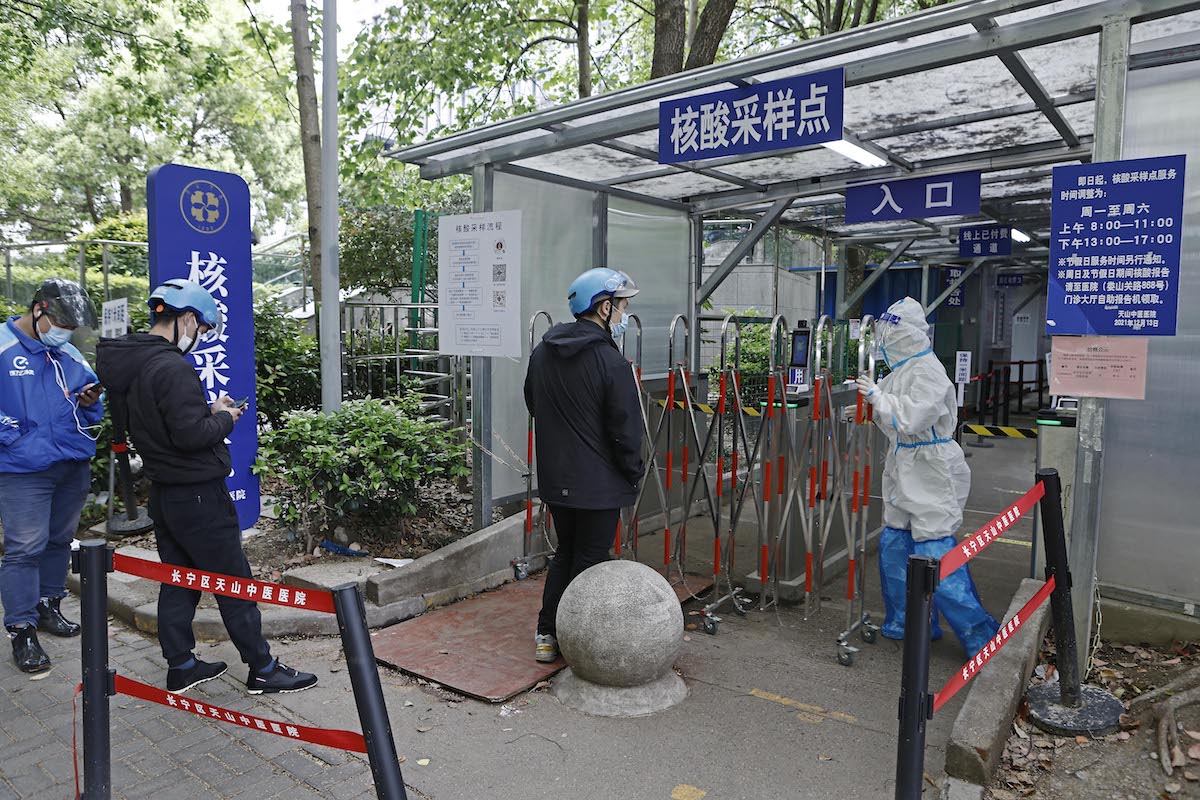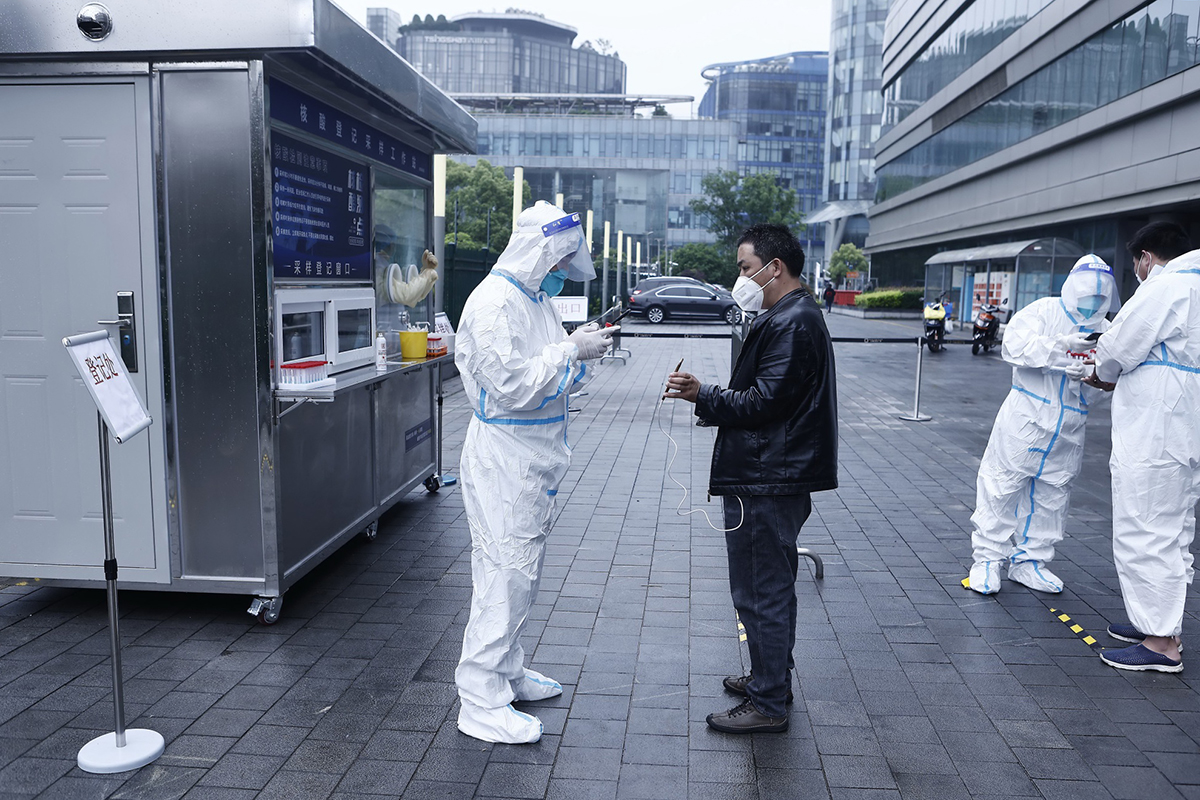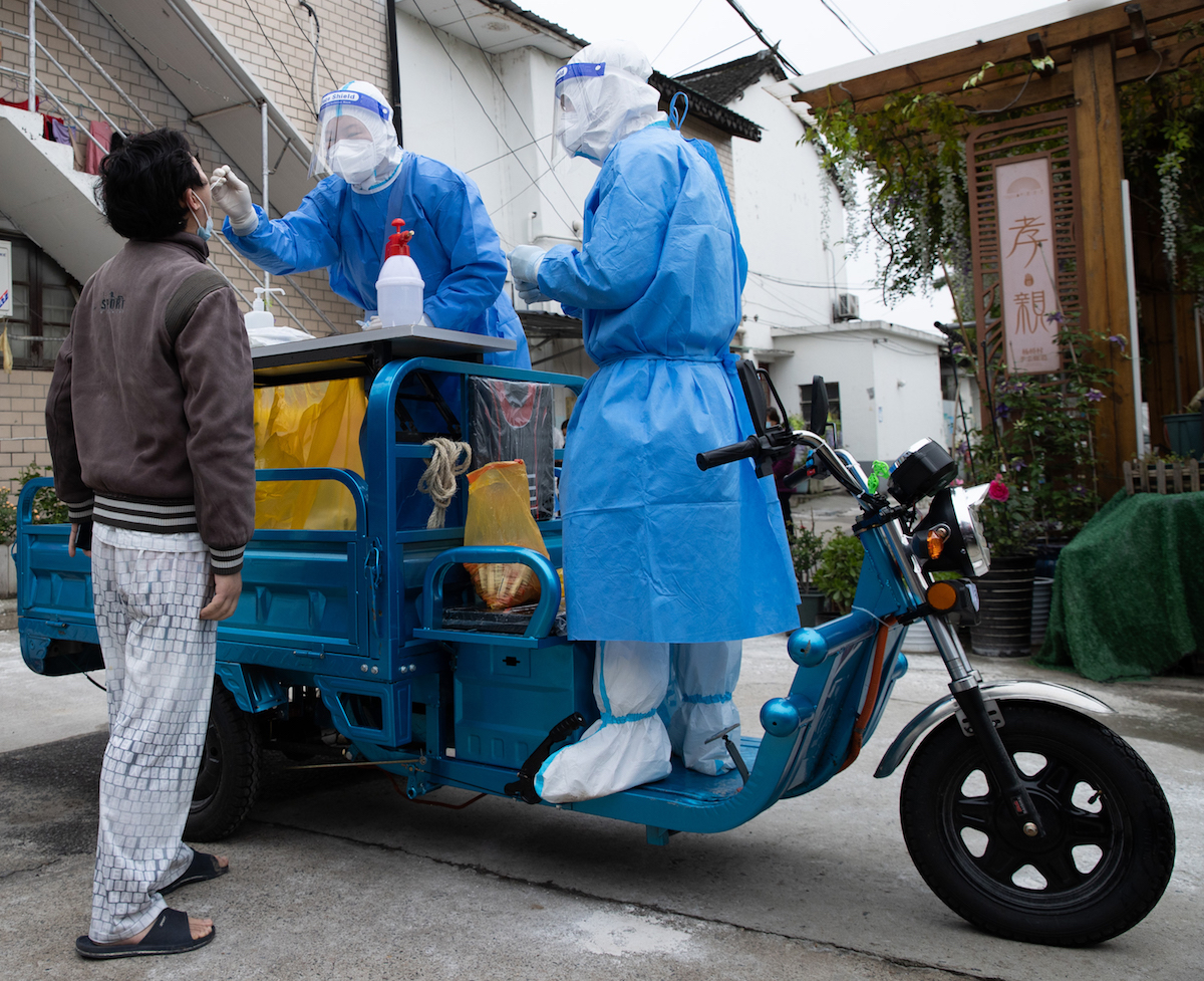 2022年4月24日,上海,天山路芙蓉江路口一座迷你核酸采样工作站,为不少流动快递员及保供人员提供了便利的核酸检测服务。