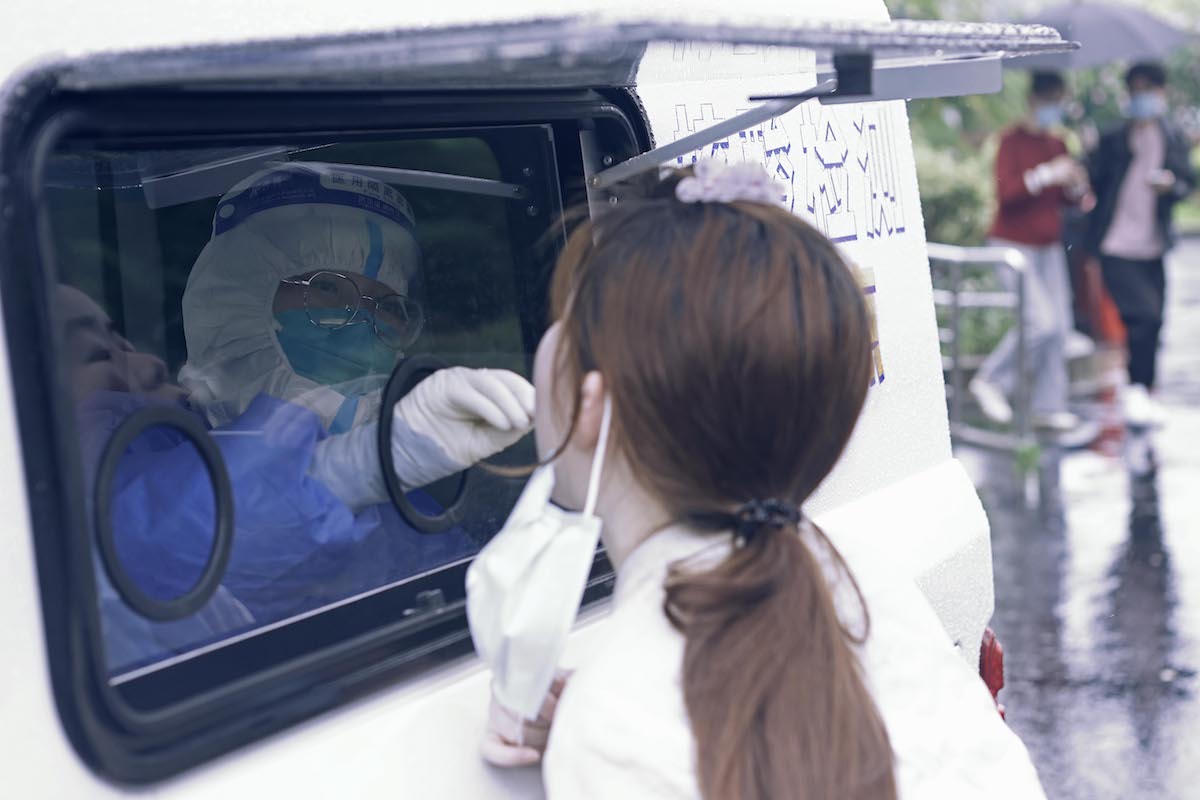 2022年4月26日,在上海市闵行区金都路,市民在核酸检测车外进行核酸采样。