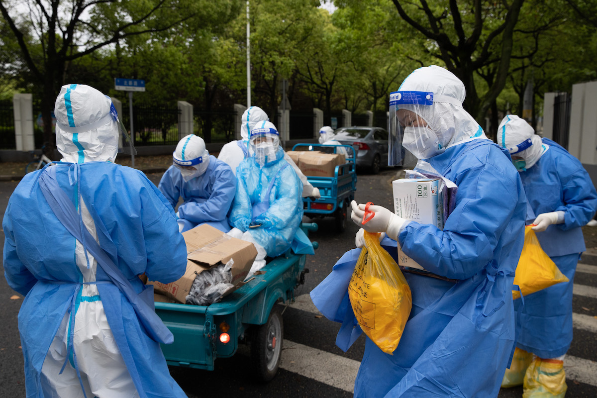 2022年4月26日,在上海市北蔡镇杨桥村,东方医院的医护人员和由村委会工作人员组成的志愿者坐上三轮车,准备给村民做核酸采样。