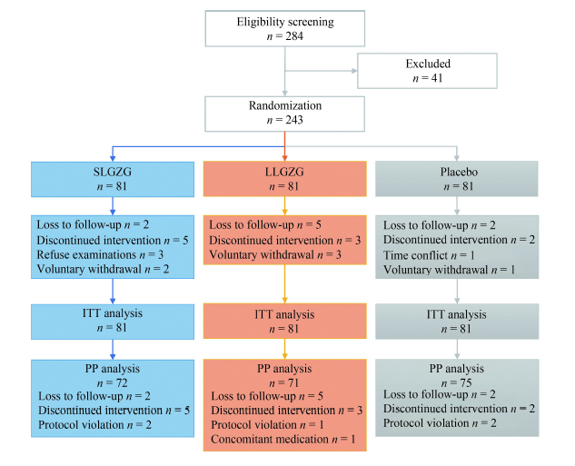 为填补经典名方治疗NAFLD缺乏高级别循证证据这一空白,研究团队启动了“苓桂术甘汤治疗NAFLD脾阳虚证的疗效和安全性的多中心随机对照试验”,在张江、北蔡、三林三家社区卫生服务中心共计招募了243名符合标准的NAFLD脾阳虚证患者,随机分为3组,分别接受标准剂量苓桂术甘汤、低剂量苓桂术甘汤和安慰剂治疗12周,主要疗效指标为胰岛素抵抗指数(HOMA-IR)。考虑中国人群瘦型NAFLD的流行性,研究还对受试者进行了基于身体质量指数(BMI)的疗效分层分析。临床试验方案经天游ty8线路检测中心登录附属龙华医院医学伦理委员会批准,并在中国临床试验注册中心进行了注册(ChiCTR1800014364)。