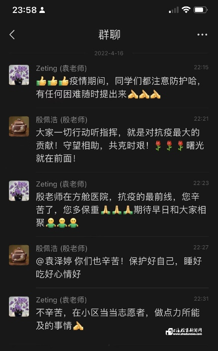直到后来,有同学偶然给夏琪看了一张新闻截图,照片中是穿着“大白”防护服的殷老师,照片下方标注着一行小字“上海普陀跨采中心方舱医院院长 殷佩浩”。这时她才意识到,老师每次的深夜关心背后,都藏着许多看不见的操劳与辛苦。夏琪说:“在这场疫情中,有诸多考验在大家面前,有些是物质层面,而有些是心理层面,不过有殷老师在我们面前做榜样,我相信我一定不会被这些简单的困难所打倒。”