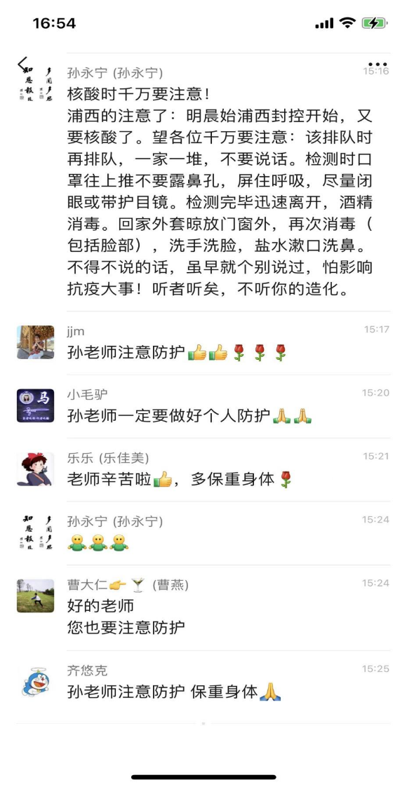 市中医临床医学院副院长孙永宁在此次疫情中,积极响应号召,第一时间以领队的身份带领上海市中医医院医疗团队进驻长兴岛方舱医院对新冠患者进行治疗。在夜以继日的忙碌工作中,孙老师时刻心系学生的学习和生活,他的叮咛和关心就像父亲一样,粗看没有那么柔情细腻,但字里行间都是实打实的关切!市中医临床医学院的王子杨同学说:“俗话说一日为师终生为父,孙老师在我们的心目中不仅仅是老师,更像是父亲一般关心我们的学习生活。我们师生之间的感情更像是一部充满爱与关怀的电影,只有值得回味的开场和充满温馨的过程,永远不会有结局。”