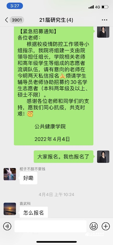 4月4日公共健康学院面向全体师生招募流调志愿者,许琪老师第一时间在师门群带头报名参加。特殊时期,许琪老师一直身体力行地带动着学生,积极发挥专业特长,从参与流调工作,到指导学生撰写防疫居家膳食等科普文章在东方网、中国营养学会官网发表,许老师带领同学们切身体悟“可以用自己所学为防疫贡献力量”。公共健康学院陈玉洁同学说:“我们在老师带领下一起积极完成流调任务,应用了专业知识也锻炼了能力,更重要的是,大家一起为守护美丽的上中医作出努力,这是非常值得我自豪的事情。”
