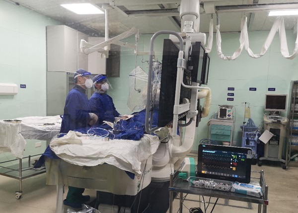 术中造影显示,金老伯前降支近段血管完全闭塞,姚望、樊荣抽吸血栓后,放入支架,迅速打开患者闭塞的血管,恢复了血供。患者意识渐渐清楚,并可对答,胸痛、胸闷的症状逐渐缓解。“手术成功!”在场的医务人员都为金老伯能跨过生死关感到庆幸。术后,金老伯核酸阴性结果出来后,立即转入了心内科监护病房继续治疗,目前恢复良好。
