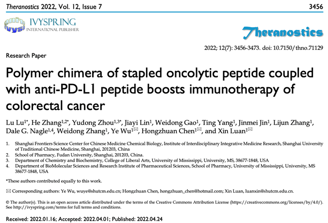 天游ty8线路官网交叉科学研究院中药系统药理学研究中心栾鑫研究员、陈红专教授和吴也博士为论文的共同通讯作者,硕士研究生卢露、张鹤及密西西比大学Dr. Yu-Dong Zhou为论文的并列第一作者。项目受到国家自然科学基金,国家中管局多学科交叉创新团队,上海市中药化学生物学前沿基地等多个项目的资助和支持。(交叉科学研究院、科技处)