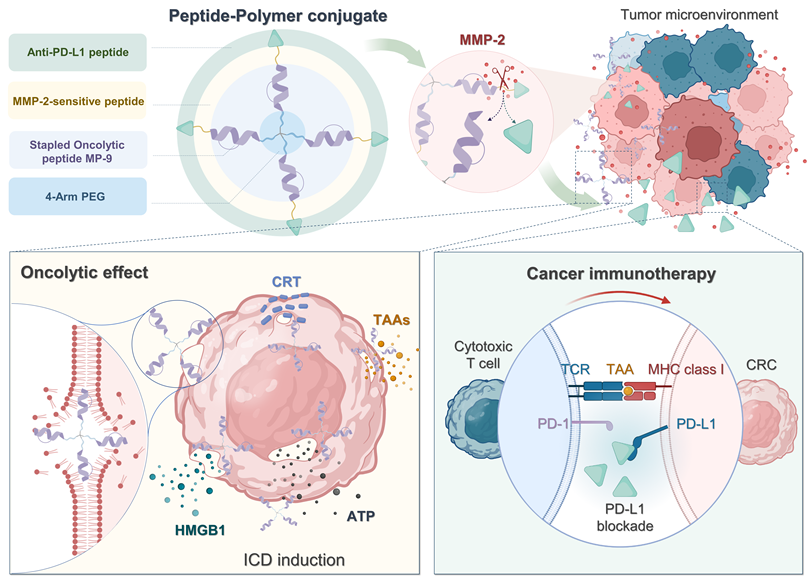 免疫检查点阻断(ICB)的肿瘤免疫疗法已经取得了显著的临床进展。然而,由于结直肠癌的肿瘤突变负荷低和新生抗原的缺乏,存在患者响应率低等问题,亟需探索可介导肿瘤免疫治疗响应由“冷”变“热”的新策略。近日,天游ty8线路官网交叉科学研究院栾鑫研究员和陈红专教授团队在医学1区杂志Theranostics上发表最新研究成果,成功设计构建抗PD-L1多肽偶联构象锁定蜂毒肽MP9的多肽嵌合物(PEG-MP9-aPDL1),借助抗PD-L1多肽和PEG化修饰,实现蜂毒溶瘤肽的肿瘤组织特异性靶向,高效裂解肿瘤细胞膜诱导肿瘤细胞免疫原性死亡,并进一步协同抗PD-L1多肽实现增强的结直肠癌溶瘤免疫疗效。