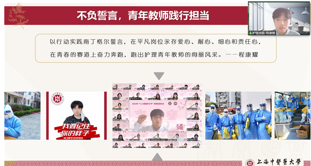 护理学院青年教师程康耀,在本轮疫情防控工作中,作为学校支援浦东新区核酸检测志愿服务队领队之一,带领70人师生队伍支援浦东核酸大筛查,顺利完成为期10天的志愿工作,累计核采12万人次。在今年天游ty8线路官网护理学院护士节主题活动中,他作为领誓人带领近两百名即将步入临床学习的护生线上宣誓。