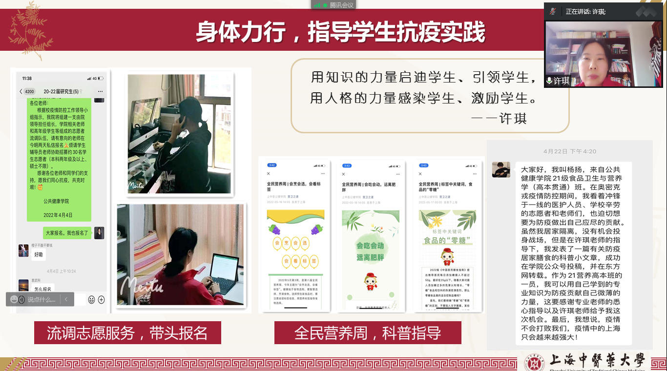 许琪提到,她目前承担三门本科、研究生教学课程,一门国际学生的全英文课程;指导学生撰写防疫居家膳食等多篇科普文章、修改学术论文,投稿SCI期刊3篇;组织开展“全民营养周”公共健康学院科普活动;招生直播、实习指导、研究生答辩、小学期实践……工作紧张而忙碌,她感到无比充实有意义,“能利用专业所学,为守护校园做出一份贡献,我觉得很自豪。我会继续带领学生用实际行动践行一名医学生的责任担当,一起为守护健康事业去付出、去努力、去奋斗。”