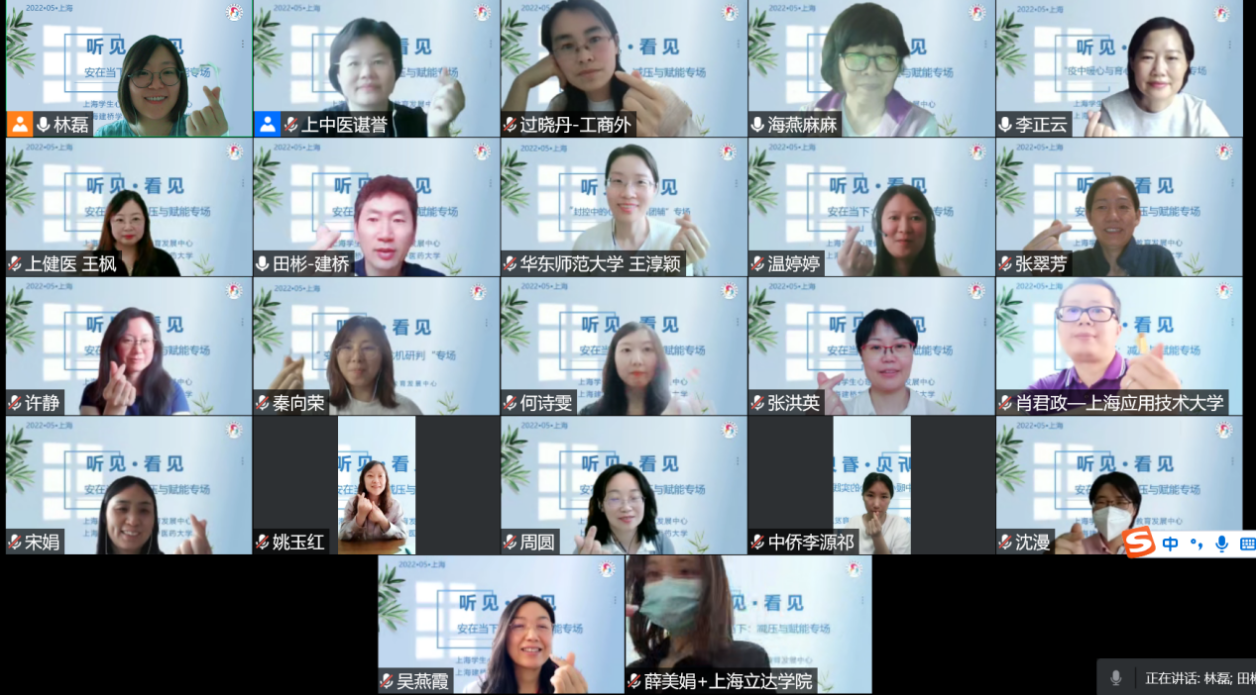 5月31日,上海学生心理健康教育发展中心主办,上海中医药大学和上海建桥学院联合举办“听见·看见”系列——安在当下,疫情中的辅导员减压与赋能专题研讨会。上海学校心理健康教育发展中心主任李正云、天游ty8线路官网学工部(研工部)部长沈漫和近20所高校心理中心负责人与专兼职心理教师等参与。天游ty8线路官网心理咨询与发展中心林磊主持会议。