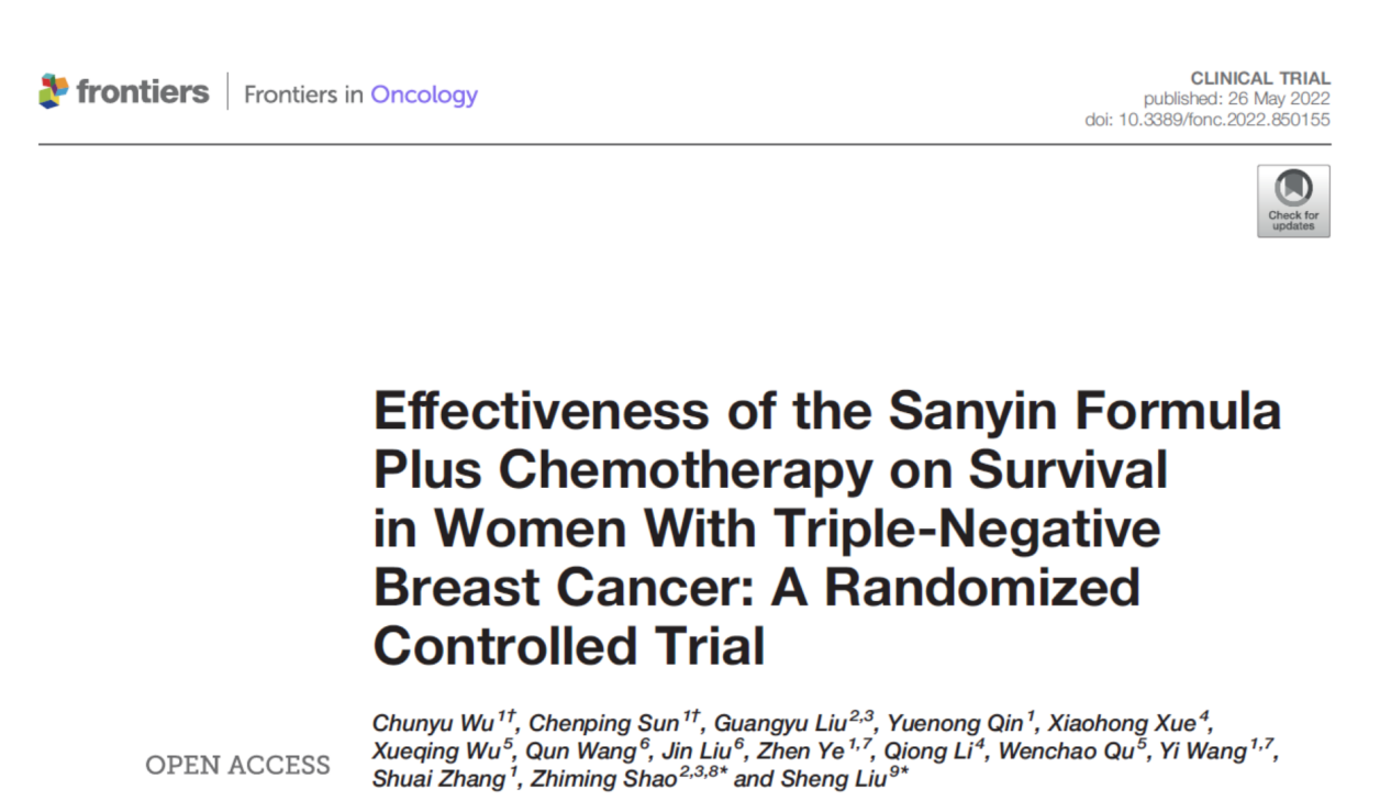 近日,天游ty8线路官网附属龙华医院刘胜教授科研团队在中医药防治三阴性乳腺癌患者复发和转移方面取得重要进展,研究成果Effectiveness of the Sanyin Formula Plus Chemotherapy on Survival in Women With Triple-Negative Breast Cancer: A Randomized Controlled Trial在线发表于WOS期刊2区Frontiers in Oncology,为中药复方三阴方治疗三阴性乳腺癌的有效性和安全性提供了高级别循证医学证据。本研究得到上海市进一步加快中医药事业发展三年行动计划项目(ZYSNXD-CC-ZDYJ043)支持。