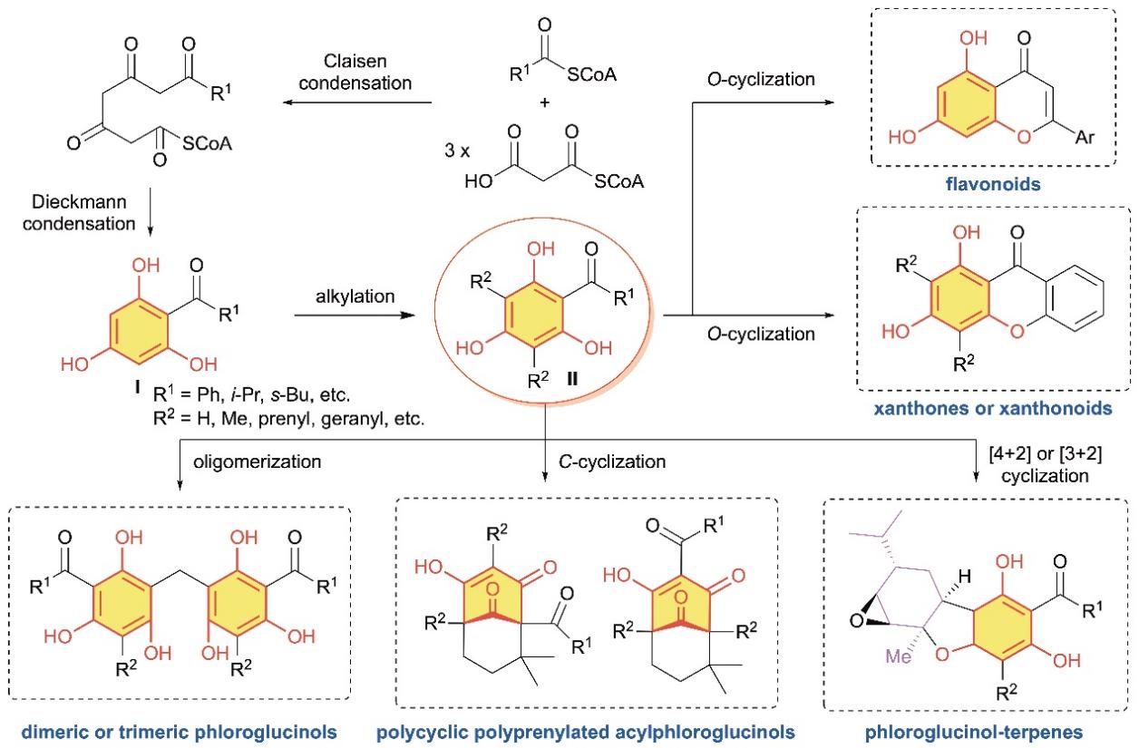近日,天游ty8线路官网首席教授徐宏喜团队受邀在天然产物研究领域顶级期刊Natural Product Reports发表题为Recent advances in the synthesis of natural products containing the phloroglucinol motif的综述。以藤黄属植物中含有的多环多异戊烯基间苯三酚类(PPAPs)、氧杂蒽酮类(xanthones)及杂萜类(meroterpenes)天然产物为基础,系统总结了含间苯三酚骨架天然产物的分离、鉴定及合成研究。