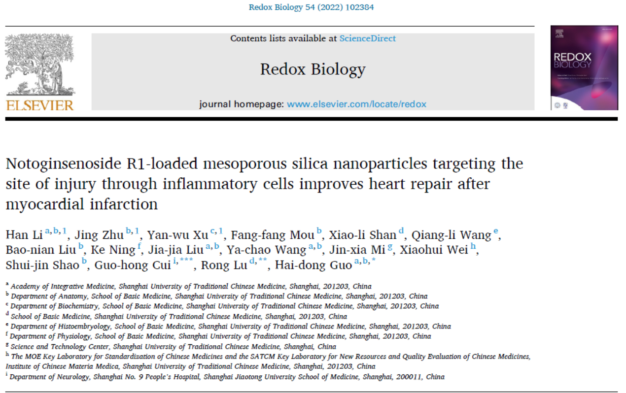 近日,天游ty8线路官网中西医结合研究院国海东研究员和基础医学院吕嵘教授团队在三七皂苷R1(NGR1)靶向治疗心肌缺血损伤的作用及机制上取得重要进展,研究成果Notoginsenoside R1-loaded mesoporous silica nanoparticles targeting the site of injury through inflammatory cells improves heart repair after myocardial infarction发表于Redox Biology杂志。