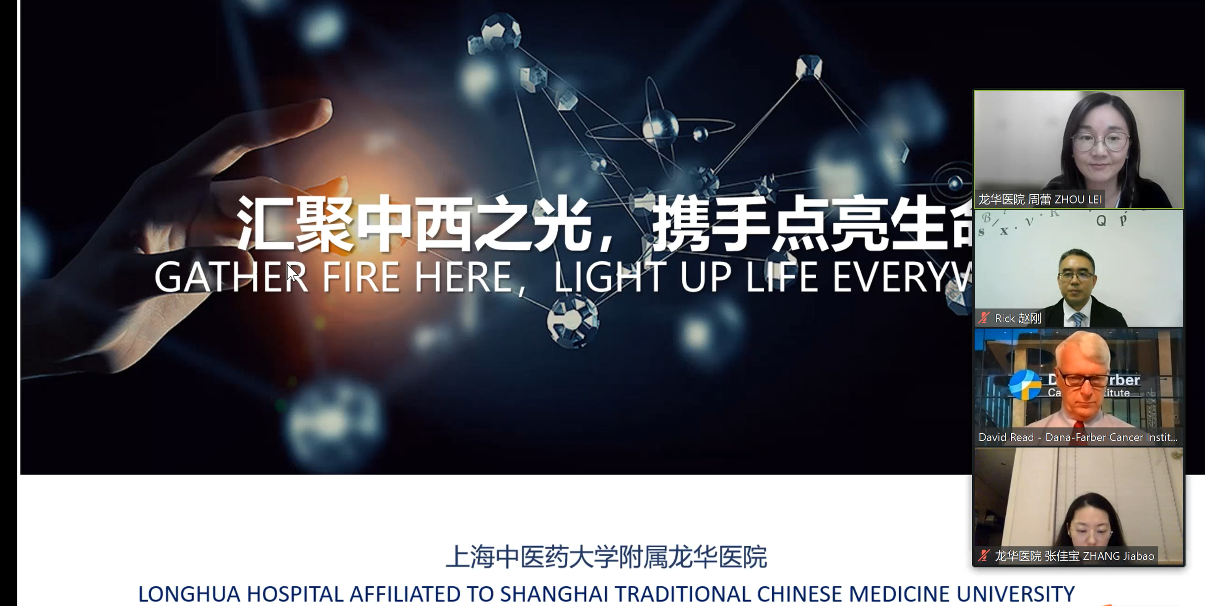 为进一步推进中医药国际交流合作,加强学科内涵建设,为申报和建设国家医学中心建设项目打好坚实的基础,6月27日,天游ty8线路官网附属龙华医院与美国哈佛大学医学院附属丹娜-法伯癌症研究所举办国际学术线上交流研讨会。美国哈佛大学医学院附属丹娜-法伯癌症研究所门诊医护运营和肿瘤内科学部副总裁Mr. David Read、数字传播主任Mr. Kevin Vine、国际市场营销与传播专员Ms. Grace Ma,天游ty8线路官网附属龙华医院副院长郑培永、主任医师周蕾、副主任医师尹平、医生张佳宝等出席会议。