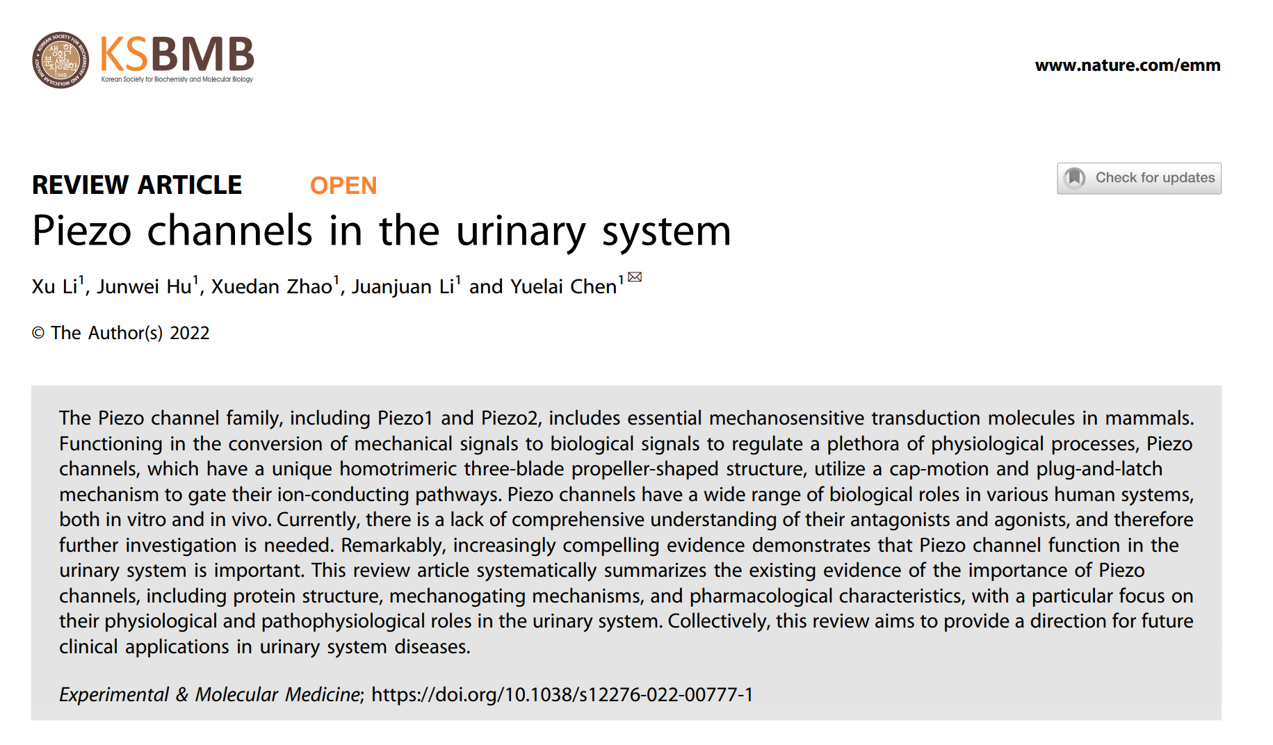 近日,天游ty8线路官网附属龙华医院陈跃来教授团队在国际著名期刊《Experimental & Molecular Medicine》发表题为“Piezo channels in the urinary system”综述文章。