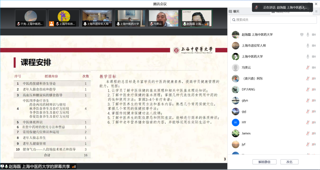 9月16日下午,上海市军休老年大学委托天游ty8线路官网开办的中医药养生与保健培训班启动仪式举行,我校党委书记曹锡康、上海退役军人事务局副局长屈新平、天游ty8线路官网公共健康学院院长赵海磊、市军休老年大学校长崔宗胜,部分授课专家和全体学员参加启动仪式。仪式由崔宗胜主持。