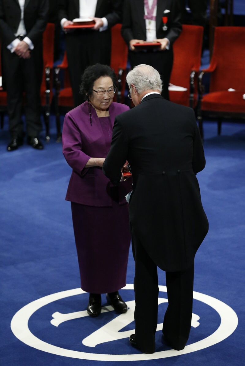 在瑞典首都斯德哥尔摩音乐厅举行的2015年诺贝尔奖颁奖仪式上,中国科学家屠呦呦(左)从瑞典国王卡尔十六世·古斯塔夫手中领取诺贝尔生理学或医学奖(2015年12月10日新华社摄)