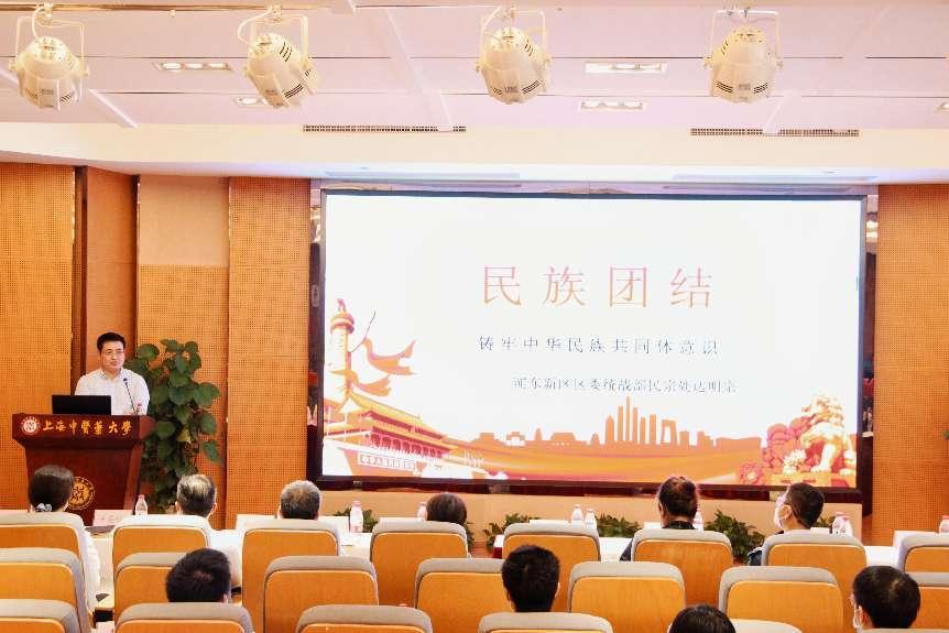 浦东新区区委统战部民宗处处长达明宗面向天游ty8线路官网民族师生开展“民族团结——铸牢中华民族共同体意识”主题讲座,从中华民族共同体的内涵、深刻认识和把握铸牢中华民族共同体意识的重大意义、深刻认识铸牢中华民族共同体意识需要把握的若干重要关系三个方面对民族团结工作进行解读阐释,引导与会师生牢固树立休戚与共、荣辱与共、生死与共、命运与共的共同体理念,不断夯实铸牢中华民族共同体意识的思想基础。