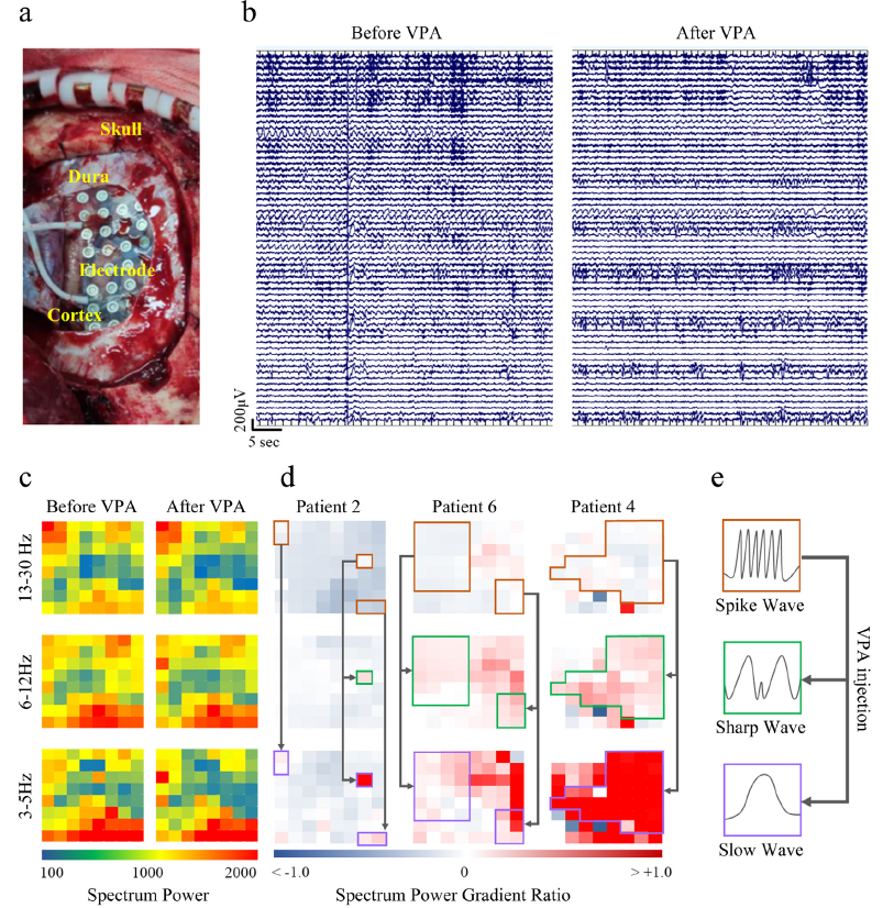 丙戊酸钠是治疗全身性和局灶性癫痫发作最有效的抗癫痫药物(ASM)之一,但丙戊酸钠单药治疗不能有效控制部分患者癫痫发作。在本研究中,课题组对16例癫痫患者进行清醒开颅手术,术中同步采用高密度脑皮层电位(ECoG) 监测。神经电信号结果显示术后患者癫痫发作控制不佳与丙戊酸钠单药治疗后皮层电位的异常显著回升(兴奋性反弹)密切相关(p = 0.008),并且伴随着显著的大脑皮层局部场电位(LFP)的同步性增强。