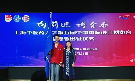 校党委副书记、副校长朱惠蓉为第五届进博会志愿者代表授旗。她用奏响“青春三部曲”勉励志愿者们,燃青春之力,在服务进博中奏响青春“主题曲”;展中医药魅力,在传承发扬中奏响青春“协作曲”;注青春活力,在志愿岗位上奏响青春“奋斗曲”,在进博大舞台上展现上中医学子的奋斗激情和青春风茂。